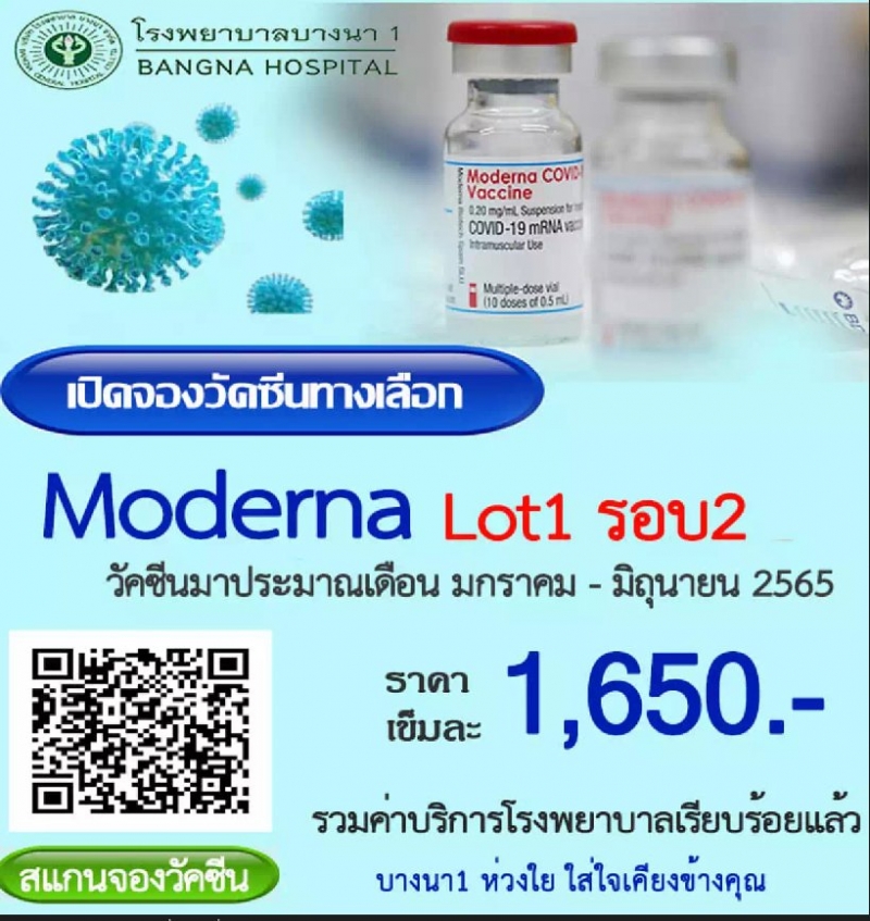 เปิดจองวัคซีน cv -19 โมเดอร์นา Moderna (รอบที่ 2) คาดว่าจะได้รับวัคซีนไตรมาสที่ 1-2 ของปีหน้า หรือในช่วงเดือนมกราคม - มิถุนายน 2565 ราคาวัคซีนทางเลือก โมเดอร์นา เข็มละ 1,650 บาท ซึ่งลูกค้าต้องชำระก่อน 1,200 บาท (ส่วนที่เหลือชำระก่อนเข้ารับบริการ) ลงทะเบียนผ่านช่องทางเว็บไซต์ คลิก