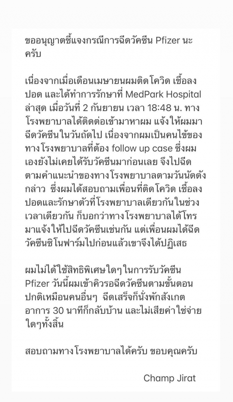 และล่าสุดวันที่ 4 ก.ย.64 เจ้าตัวได้รีบออกมาเคลียร์ว่าไม่ได้รับสิทธิพิเศษใดๆ โดยโพสต์อธิบายดังนี้