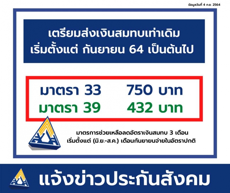 หลังจากลดจ่ายเงินสมทบประกันสังคมจาก 5% เหลือ 2.5% เป็นเวลา 3 เดือน ตั้งแต่ เดือน มิถุนายน - สิงหาคม 2564