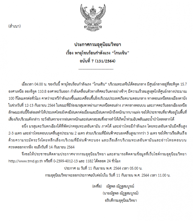 กรมอุตุฯ ประกาศเตือนฉบับ 7 พายุโซนร้อน โกนเซิน