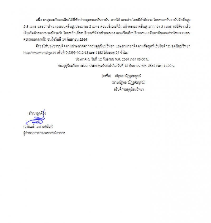 อนึ่ง มรสุมตะวันตกเฉียงใต้ที่พัดปกคลุมทะเลอันดามัน ภาคใต้ และอ่าวไทยมีกำลังแรง โดยทะเลอันดามันมีคลื่นสูง 2-3 เมตร และอ่าวไทยตอนบนคลื่นสูงประมาณ 2 เมตร ส่วนบริเวณที่มีฝนฟ้าคะนองคลื่นสูงมากกว่า 3 เมตร ขอให้ชาวเรือเดินเรือด้วยความระมัดระวัง โดยหลีกเลี่ยงบริเวณที่มีฝนฟ้าคะนอง และเรือเล็กบริเวณทะเลอันดามันและอ่าวไทยตอนบน ควรงดออกจากฝั่ง จนถึงวันที่ 14 กันยายน 2564