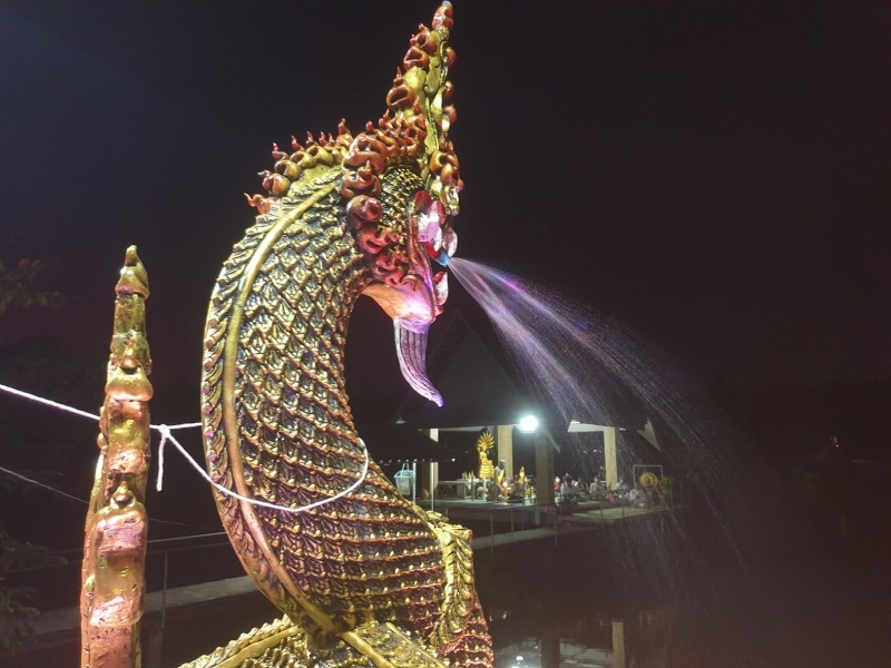 โดยก่อนการประกอบพิธีเกิดฝนตกลงมาอย่างหนัก จนทางวัดคิดว่าคงไม่สามารถประกอบพิธีได้ตามปกติ เนื่องจากบริเวณที่ประกอบพิธีเป็นสถานที่กลางแจ้งริมบึงใหญ่ไม่มีหลังคากันฝนแต่อย่างใด จนในที่สุด พระอธิการสมชาย อภิชโย พร้อมผู้เฒ่าผู้แก่ในหมู่บ้าน นำเครื่องเซ่นไหว้พญานาคไปวางพร้อมจุดธูป เทียนบูชาบนบานขอให้ฝนหยุดตก เพื่อจะได้ประกอบพิธีตามลำดับขั้นตอนด้วยความราบรื่นต่อไป และได้เกิดอัศจรรย์ก็เกิดขึ้นเป็นที่ประจักษ์เมื่อฝนได้หยุดตกอย่างสิ้นเชิง แต่ท้องฟ้ายังมืดครึ้มบดบังดวงจันทร์ และดวงดาวไว้ทั้งหมด