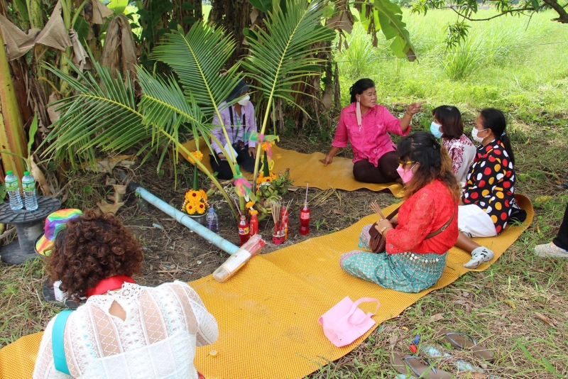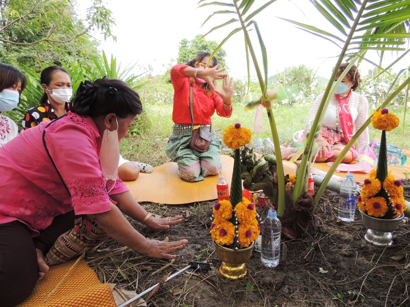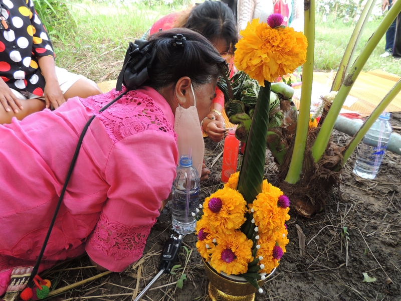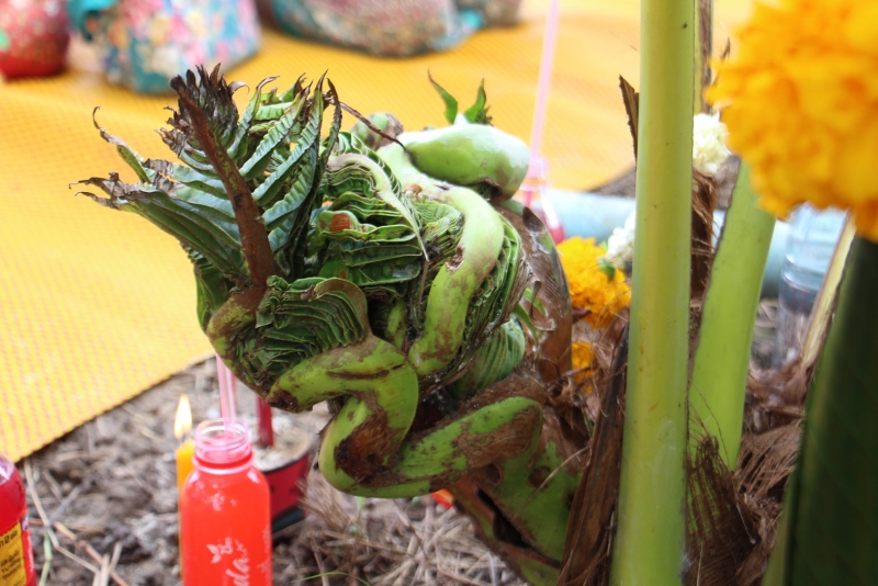 ใกล้ ๆ กัน มีบายศรีดอกไม้สดตั้งไว้ด้านข้าง มีน้ำแดงตั้งไว้ด้านหน้า และพวงมาลัยคล้องไว้ที่บริเวณก้านใบ ส่วนช่วงข้อต่อที่ออกคล้ายเศียรพญานาค ชาวบ้านหลายคนได้นำธูป เทียน มาจุดสักการะบูชา บอกกล่าวขอพร