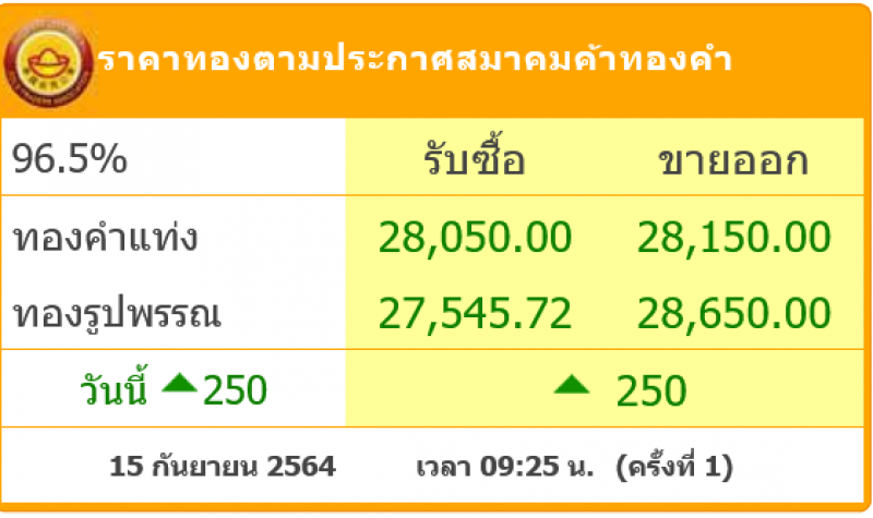 วันที่ 15 กันยายน 2564 สมาคมค้าทองคำรายงาน ราคาทองไทย ครั้งที่ 1 เมื่อเวลา 09:28 น. โดยราคาทองล่าสุดราคานั้น ได้มีการปรับพุ่งขึ้นมาอีก 250 ส่งผลทำให้ราคาวันนี้ทองคำแท่ ง รับซื้อบาทละ 28,050 ขายออกบาทละ 28,150 บาท ส่วนทองรูปพรรณ รับซื้อบาทละ 27,545.72 ขายออกบาทละ 28,650 บาท