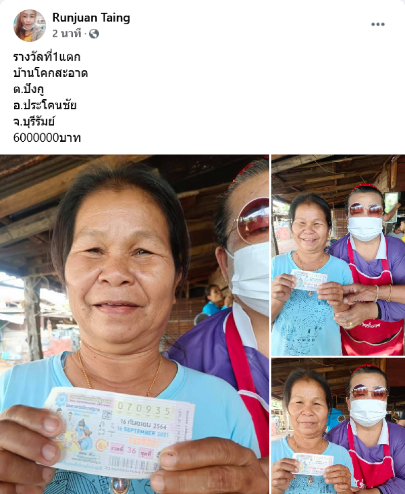 ล่าสุดในโลกออนไลน์มีรายงานว่า ผู้ใช้เฟซบุ๊ก Runjuan Taing ได้โพสต์ภาพ คุณป้าท่านหนึ่ง ซึ่งเป็นผู้ถูกรางวัลที่ 1 โดยระบุว่า รางวัลที่1 แตก บ้านโคกสะอาด ต.ปังกู อ.ประโคนชัย จ.บุรีรัมย์ 6000000บาท ท่ามกลาวชาวโซเชียลที่มาร่วมแสดงความคิดเห็นยินดี
