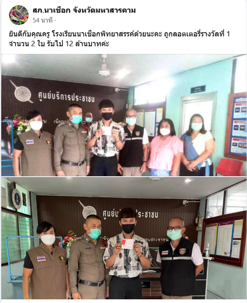 ล่าสุดในโลกออนไลน์มีรายงานว่า เฟซบุ๊กเพจ สภ.นาเชือก จังหวัดมหาสารคาม ได้โพสต์ภาพ คุณครูท่านหนึ่ง ซึ่งเป็นผู้ถูกรางวัลที่ 1 โดยระบุว่า ยินดีกับคุณครู โรงเรียนนาเชือกพิทยาสรรค์ด้วยนะคะ ถูกลอตเตอรี่รางวัลที่ 1 จำนวน 2 ใบ รับไป 12 ล้านบาทค่ะ ท่ามกลาวชาวโซเชียลที่มาร่วมแสดงความคิดเห็นยินดี