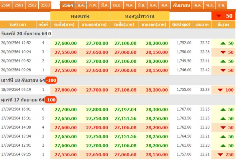 วันที่ 20 กันยายน 2564 ประกาศราคาครั้งที่ 1 (เปิดตลาด) เมื่อเวลา 09.28 น. ปรับลดลง 50 บาท เมื่อเทียบกับประกาศราคาซื้อขายครั้งเดียวของวันเสาร์ ที่ปรับลดลง 100 บาท ส่วนสัปดาห์ที่ผ่านมาราคาทองปรับลดลงรวม 100 บาท ส่วนเงินบาทอ่อนค่ากลับระดับ 33 บาท ราคาซื้อขายทองคำในประเทศชนิด 96.5% และมีการผันผวนติดๆกันอีกถึง 4 ครั้งในช่วงเช้า