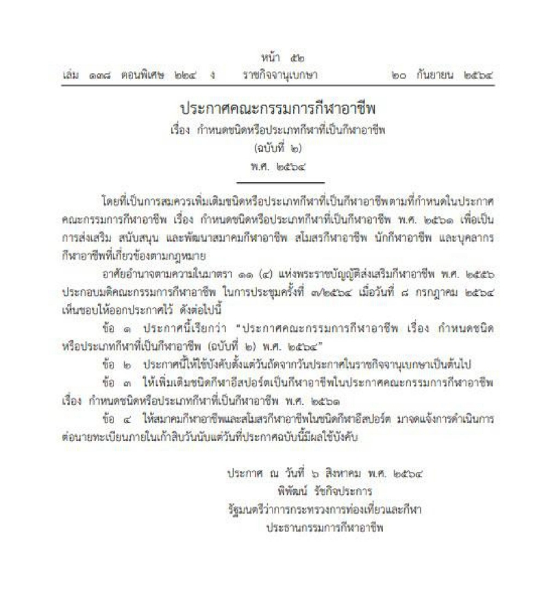 เมื่อวันที่ 21 ก.ย. 64 เว็บไซต์ราชกิจจานุเบกษา เผยแพร่ประกาศคณะกรรมการกีฬาอาชีพ เรื่อง กำหนดชนิดหรือประเภทกีฬาที่เป็นกีฬาอาชีพ (ฉบับที่ 2) พ.ศ. 2564 ระบุว่า โดยที่เป็นการสมควรเพิ่มเติมชนิดหรือประเภทกีฬาที่เป็นกีฬาอาชีพตามที่กำหนดในประกาศคณะกรรมการกีฬาอาชีพ เรื่อง กำหนดชนิดหรือประเภทกีฬาที่เป็นกีฬาอาชีพ พ.ศ. 2561 เพื่อเป็นการส่งเสริม สนับสนุน และพัฒนาสมาคมกีฬาอาชีพ สโมสรกีฬาอาชีพ นักกีฬาอาชีพ และบุคลากรกีฬาอาชีพที่เกี่ยวข้องตามกฎหมาย