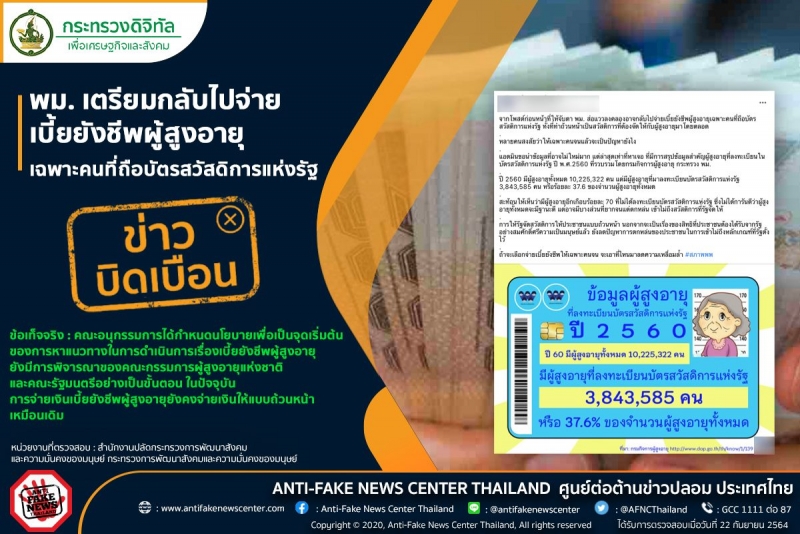 วันที่ 22 ก.ย. 64 ตามที่มีการแชร์ข่าวสารประเด็นเรื่อง พม. เตรียมกลับไปจ่ายเบี้ยยังชีพผู้สูงอายุเฉพาะคนที่ถือบัตรสวัสดิการแห่งรัฐ ทางศูนย์ต่อต้านข่าวปลอมได้ตรวจสอบข้อเท็จจริงกับ สำนักงานปลัดกระทรวงการพัฒนาสังคมและความมั่นคงของมนุษย์ กระทรวงการพัฒนาสังคมและความมั่นคงของมนุษย์ พบว่าข้อมูลดังกล่าวนั้น เป็นข้อมูลบิดเบือน