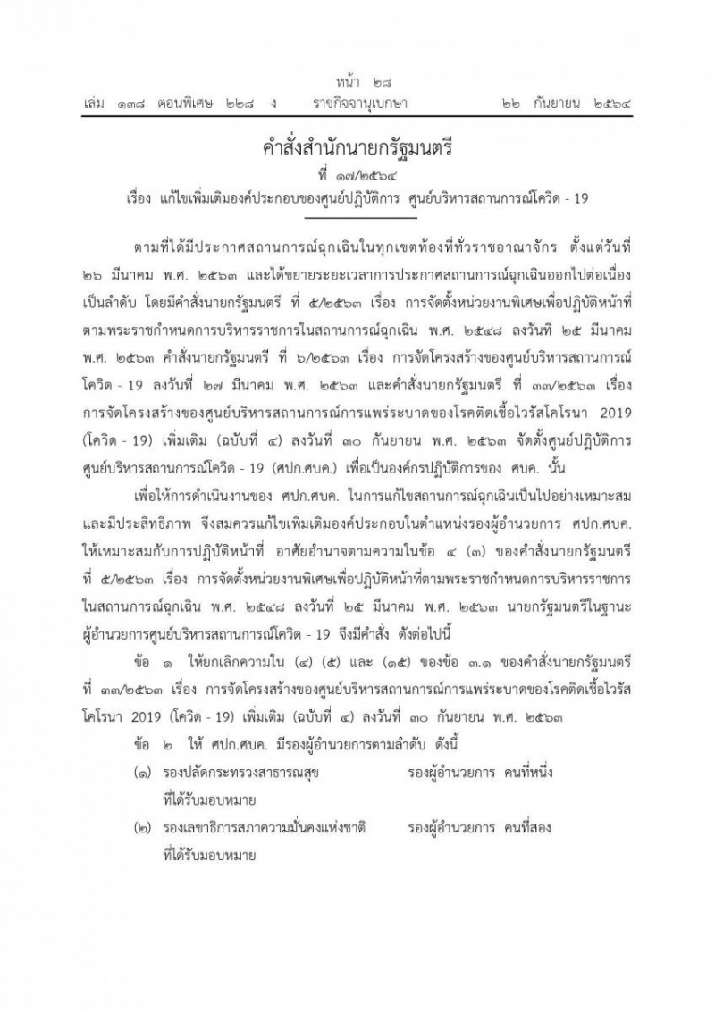 คำสั่งสำนักนายกรัฐมนตรี ที่ 17/2564 เรื่อง แก้ไขเพิ่มเติมองค์ประกอบของศูนย์ปฏิบัติการ ศูนย์บริหารสถานการณ์ cv-19 ระบุว่า