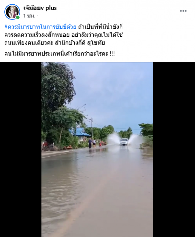 กลายเป็นอีกหนึ่งเรื่องราวที่เรียกเสียงวิพากษ์วิจารณ์อย่างมากในโลกออนไลน์ วันที่ 25 ก.ย.เฟซบุ๊กเพจ เจ๊ม้อยv plus ได้มีการลงคลิปพร้อมระบุว่า ควรมีมารยาทในการขับขี่ด้วย ถ้าเป็นที่ที่มีน้ำขังก็ ควรลดความเร็วลงสักหน่อย อย่าลืมว่าคุณไม่ได้ใช้ ถนนเพียงคนเดียวค่ะ สำนึกบ้างก็ดี สุโขทัย คนไม่มีมารยาทประเภทนี้เค้าเรียกว่าอะไรคะ