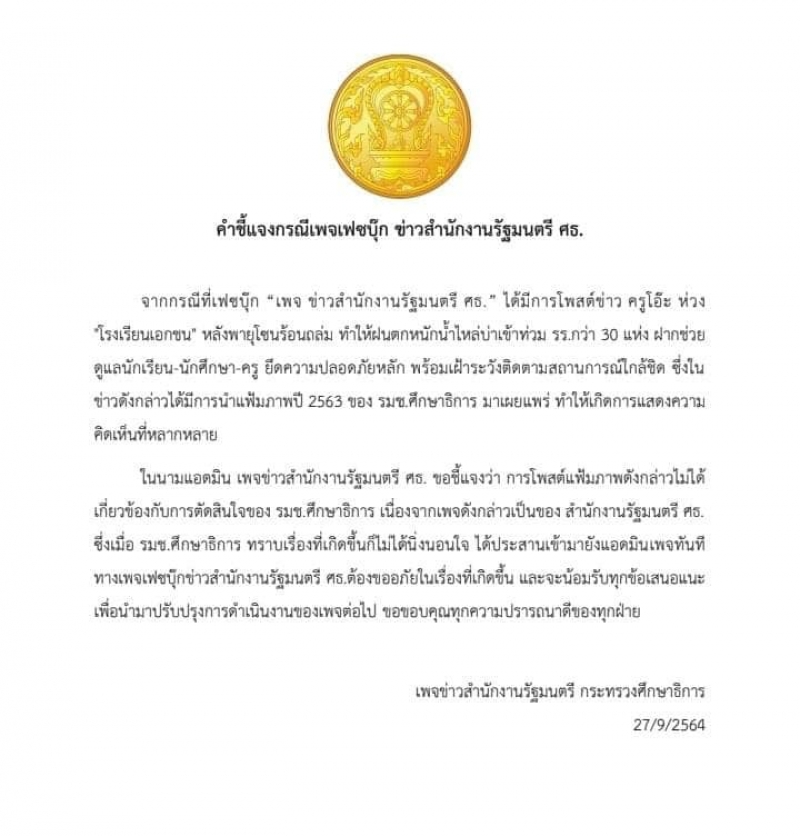ล่าสุด แฟนเพจดังกล่าวได้ออกหนังสือชี้แจง โดยระบุว่าการโพสต์ภาพดังกล่าว และแฟ้มภาพปี 2563 ไม่ได้เกี่ยวกับการตัดสินใจของ รมช.ศึกษาธิการ แต่อย่างใด พร้อมขออภัยจากเรื่องที่เกิดขึ้น