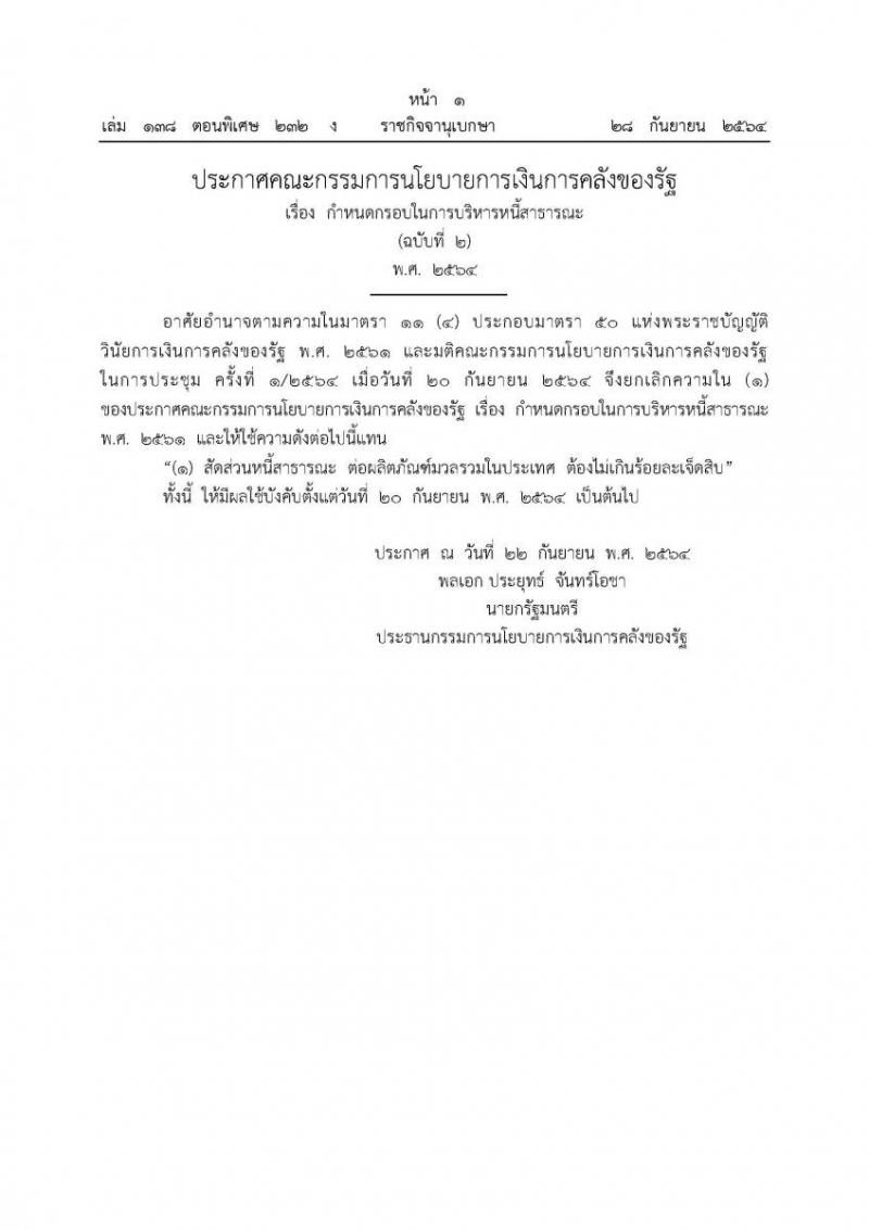 วันที่ 28 กันยายน 2564 เว็บไซต์ราชกิจจานุเบกษา เผยแพร่ประกาศคณะกรรมการนโยบายการเงินการคลังของรัฐ เรื่อง กำหนดกรอบในการบริหารหนี้สาธารณะ (ฉบับที่ 2) พ.ศ.2564 อาศัยอำนาจตามความในมาตรา 11(4) ประกอบมาตรา 50 แห่งพระราชบัญญัติวินัยการเงินการคลังของรัฐ พ.ศ.2561 และมติคณะกรรมการนโยบายการเงินการคลังของรัฐในการประชุม ครั้งที่ 1/2564 เมื่อวันที่ 20 กันยายน 2564 จึงยกเลิกความใน (1) ของประกาศคณะกรรมการนโยบายการเงินการคลังของรัฐ เรื่อง กำหนดกรอบในการบริหารหนี้สาธารณะ พ.ศ.2561 และให้ใช้ความดังต่อไปนี้แทน