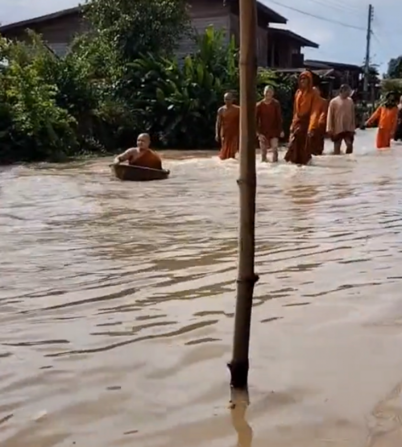 สามเณรนั่งบนกะละมัง ลอยน้ำท่วมหน้าวัด