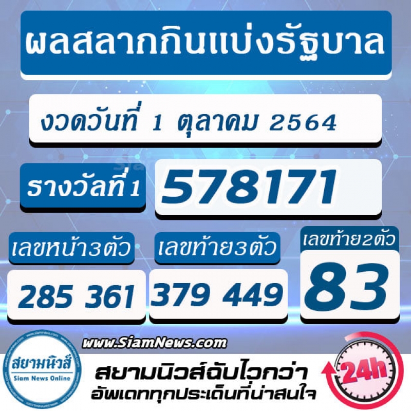 ผ่านไปแล้วสำหรับการประกาศผลสลากกินแบ่งรัฐบาล ประจำวันที่ 1 ตุลาคม 2564 รางวัลที่ 1 ออกหมายเลข 578171 ส่วนรางวัล เลขหน้า 3 ตัว ออกหมายเลข 285 และ 361 รางวัลเลขท้าย 3 ตัว ออกหมายเลข 379 และ 449 ขณะที่รางวัลเลขท้าย 2 ตัว ออกหมายเลข 83
