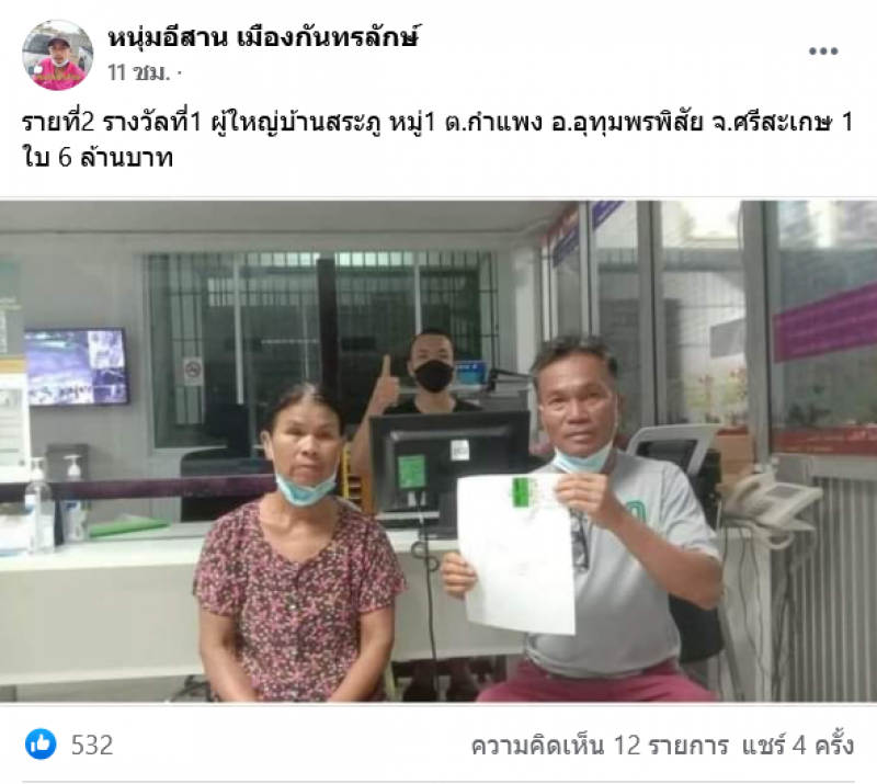ทั้งนี้พบว่า ในโลกออนไลน์มีรายงานว่า ผู้ใชเเฟซบุ๊ก หนุ่มอีสาน เมืองกันทรลักษ์ ได้โพสต์ภาพ คนถูกรางวัลที่ 1 โดยระบุว่า รายที่2 รางวัลที่1 ผู้ใหญ่บ้านสระภู หมู่1 ต.กำแพง อ.อุทุมพรพิสัย จ.ศรีสะเกษ 1 ใบ 6 ล้านบาท ท่ามกลาวชาวโซเชียลที่มาร่วมแสดงความคิดเห็นยินดี