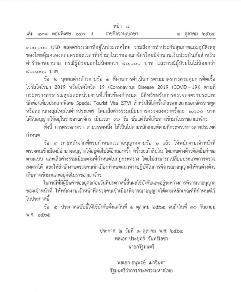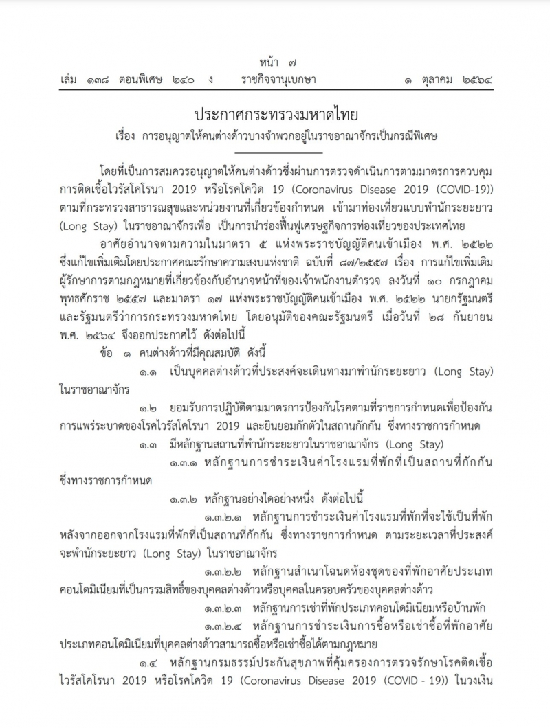 วันที่ 1 ตุลาคม 2564 เว็บไซต์ราชกิจจานุเบกษา เผยแพร่ประกาศกระทรวงมหาดไทย เรื่องการอนุญาตให้คนต่างด้าวบางจำพวกอยู่ในราชอาณาจักรเป็นกรณีพิเศษ ระบุ ให้คนต่างด้าวซึ่งผ่านการตรวจดำเนินการตามมาตรการควบคุมการ cv-19 เข้ามาท่องเที่ยวแบบพำนักระยะยาว (Long Stay) ในราชอาณาจักร เพื่อเป็นการนำร่องฟื้นฟูเศรษฐกิจการท่องเที่ยวของประเทศไทย