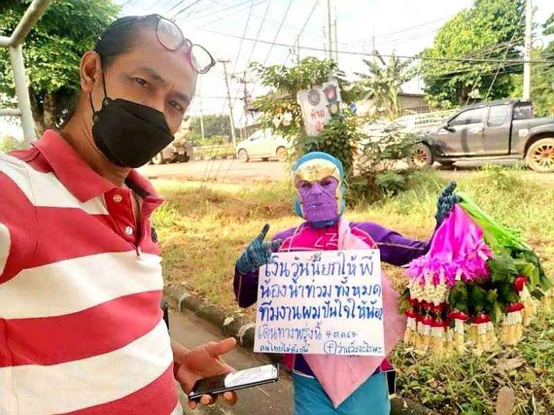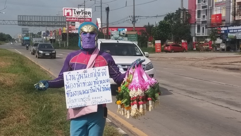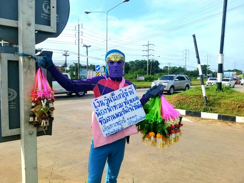 วันที่ 3 ตุลาคม เฟซบุ๊เพจ สื่อปราจีน ใครที่ผ่านแยกไฟแดงบ้านคลองรั้ง ต.ท่าตูม อ.ศรีมหาโพธิ จ.ปราจีนบุรี ช่วยกันอุดหนุนพวงมาลัยหน้ากากยอดมนุษย์ด้วยนะครับ เพราะเนื่องจากสุานการณ์น้ำท่วมในหลายจังหวัดที่เป็นอยู่ขณะนี้ ทำให้หนุ่มขายพวงมาลัยรายนี้ อยากช่วยเกลือสังคม โดยการขายพวงมาลัย พร้อมกับป้ายตล้องคอ