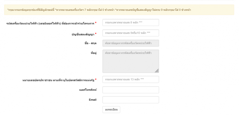 กรอกรหัสเครื่องวัดหน่วยไฟฟ้า (เลขมิเตอร์ไฟฟ้า) ที่ต้องการเข้าร่วมโครงการ (เฉพาะหมายเลข 8 หลัก)