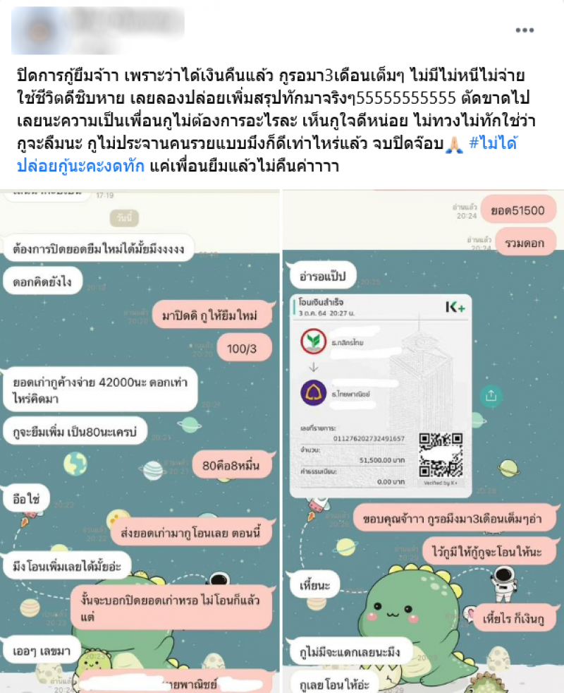 โดยผู้โพสต์ระบุว่า โพสต์ดังกล่าวระบุว่า ปิดการกู้ยืมจ้าา เพราะว่าได้เงินคืนแล้ว รอมา3เดือนเต็มๆ ไม่มี ไม่หนี ไม่จ่าย ใช้ชีวิตดีXXหายเลย ลองปล่อยเพิ่มสรุปทักมาจริงๆ 55555555555 ตัดขาดไปเลยนะความเป็นเพื่อน ไม่ต้องการอะไรละ เห็นใจดีหน่อย ไม่ทวงไม่ทักใช่ว่าจะลืมนะ ไม่ประจานคนรวยแบบ...ก็ดีเท่าไหร่แล้ว จบปิดจ๊อบ #ไม่ได้ปล่อยกู้นะคะงดทัก แค่เพื่อนยืมแล้วไม่คืนค่าาาา