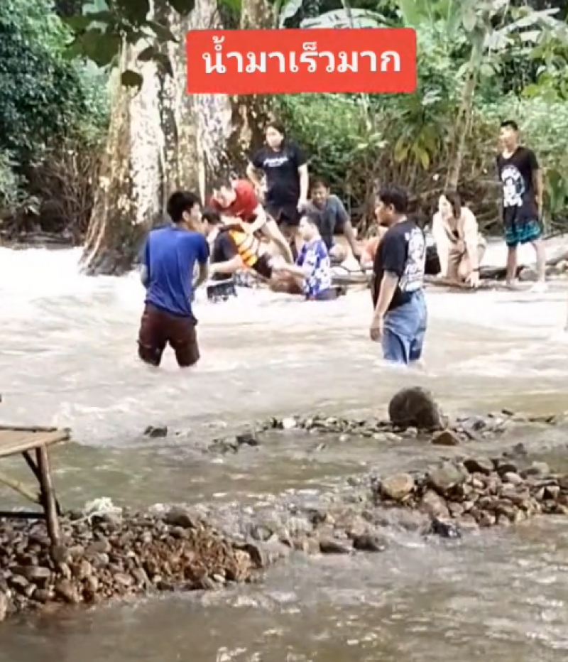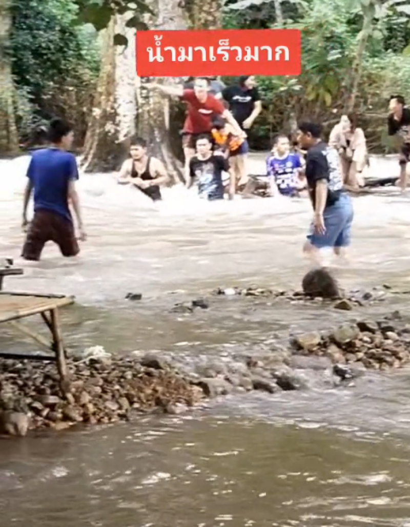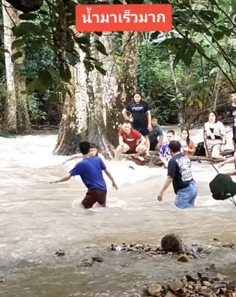 ทางด้านเจ้าหน้าที่และชาวบ้าน รีบเข้าช่วยเหลือ โดยใช้เชือกผูกที่ตัวนักท่องเที่ยวกับต้นไม้อีกฝั่ง เพื่อให้ฝ่ากระแสน้ำข้ามกลับมาได้ทีละคน ซึ่งการช่วยเหลือสำเร็จลุล่วงไปด้วยดี ทุกคนปลอดภัย