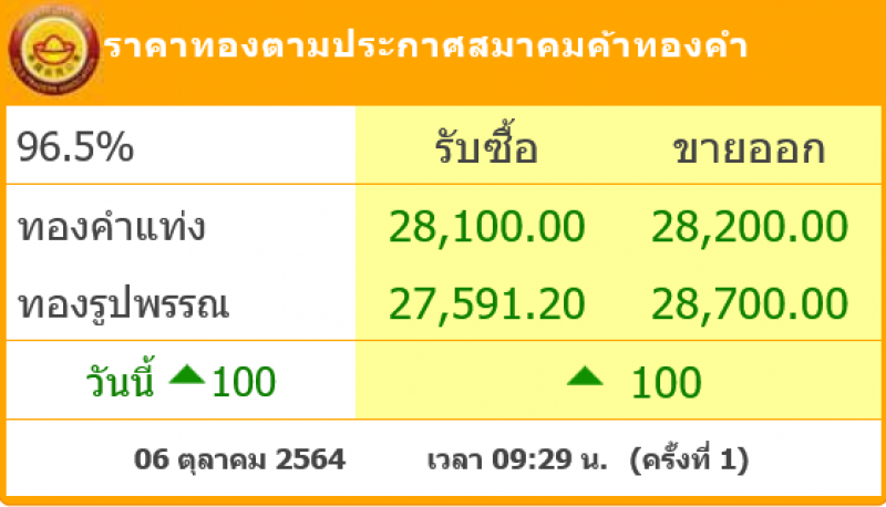 วันที่ 6 ตุลาคม 2564 สมาคมค้าทองคำรายงาน ราคาทองไทย ครั้งที่ 1 เมื่อเวลา 09:31 น. โดยราคาทองล่าสุดราคานั้น ได้มีการปรับพุ่งขึ้นมาอีก 250 ส่งผลทำให้ราคาวันนี้ทองคำแท่ ง รับซื้อบาทละ 28,150ขายออกบาทละ 28,250 บาท ส่วนทองรูปพรรณ รับซื้อบาทละ 27,636.68 ขายออกบาทละ 28,750 บาท