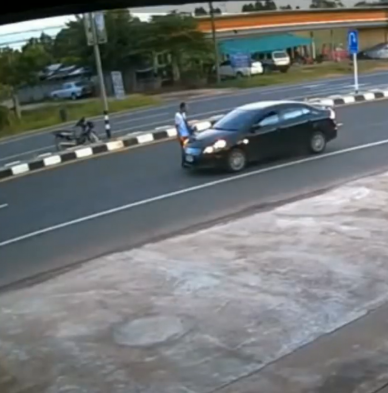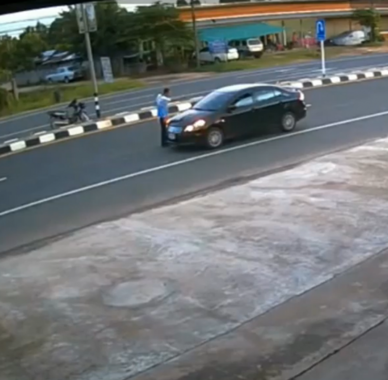 หนุ่มพนักงานปั๊ม ขวางรถเก๋ง