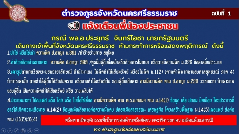 ขณะเดียวกัน ตำรวจภูธรจังหวัดนครศรีธรรมราช โพสต์ข้อความประชาสัมพันธ์ผ่านทางเฟซบุ๊ก ระบุว่า แจ้งเตือนพี่น้องประชาชน กรณี พล.อ.ประยุทธ์ พร้อมคณะเดินทางเข้าพื้นที่ จ.นครศรีธรรมราช ห้ามกระทำ หรือแสดงพฤติการณ์ ดังนี้