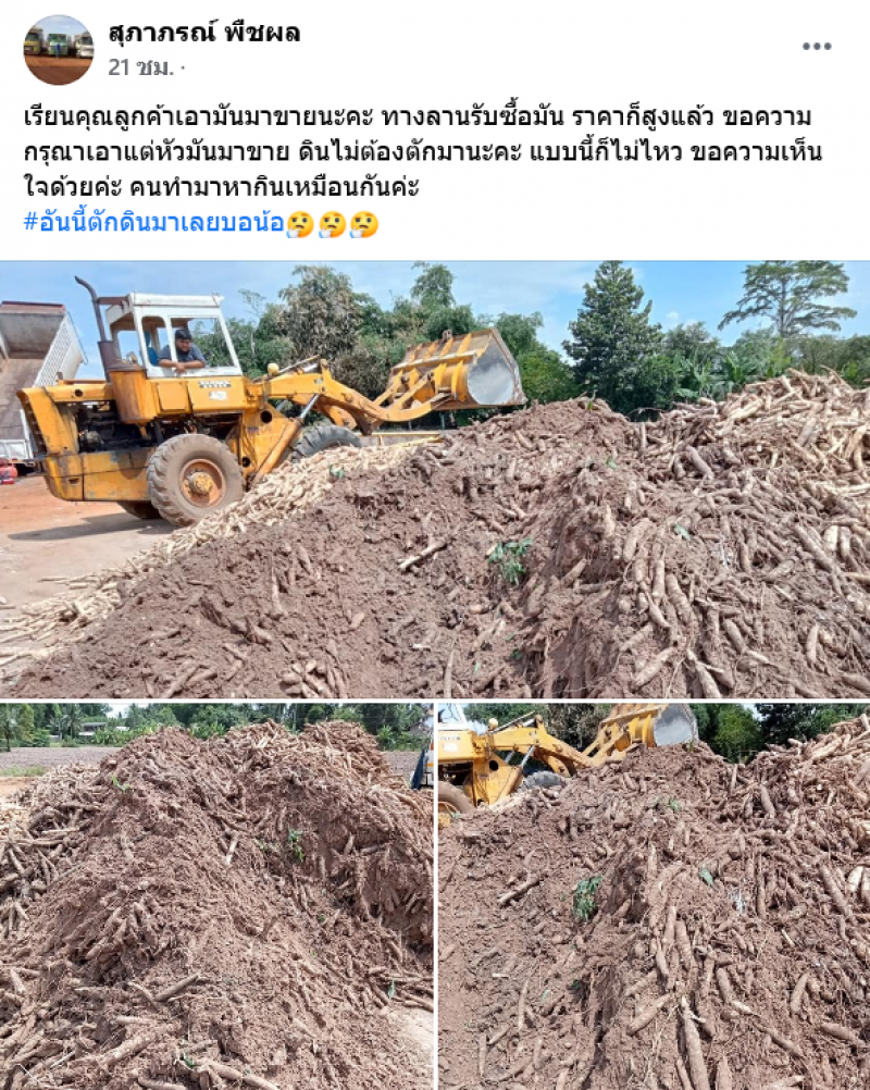 โดยผู้โพสต์ระบุว่า เรียนคุณลูกค้าเอามันมาขายนะคะ ทางลานรับซื้อมัน ราคาก็สูงแล้ว ขอความกรุณาเอาแต่หัวมันมาขาย ดินไม่ต้องตักมานะคะ แบบนี้ก็ไม่ไหว ขอความเห็นใจด้วยค่ะ คนทำมาหากินเหมือนกันค่ะ #อันนี้ตักดินมาเลยบอน้อ