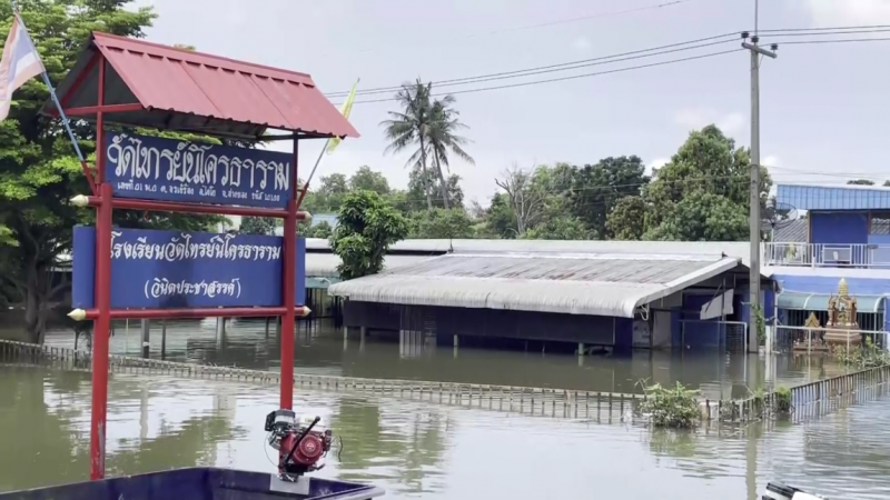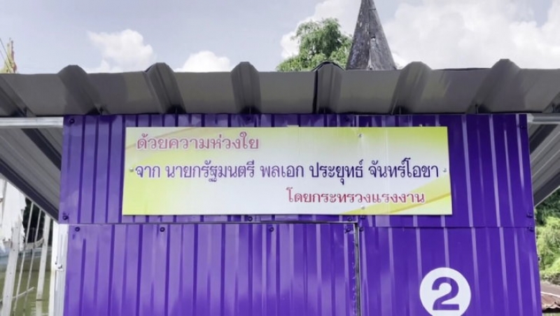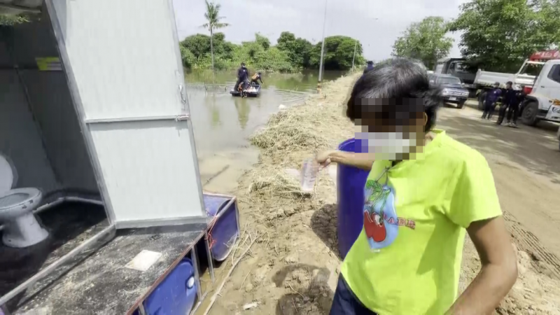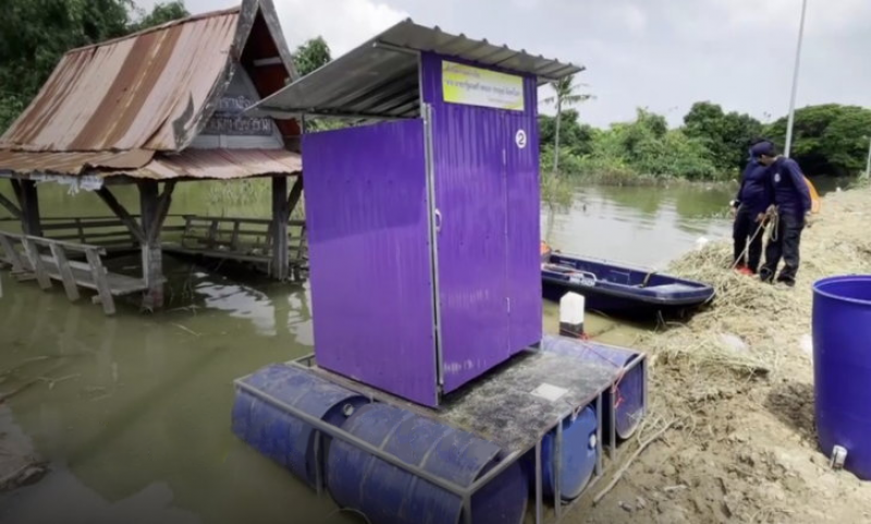 ชาวบ้านในพื้นที่หมู่ที่ 4 ต.จรเข้ร้อง อ.ไชโย จ.อ่างทอง พาไปดูส้วมลอยน้ำที่มีการนำมาติดตั้งไว้ที่บริเวณหน้าวัดไทรย์นิโครธาราม เพื่อให้ประชาชนที่ถุกน้ำท่วมสูงมานานกว่า 2 สัปดาห์ ได้ใช้ โดยเป็นส้วมลอยน้ำสร้างจากสังกะสีและถังน้ำมันขนาด 200 ลิตร บริเวณด้านหน้ามีป้ายคำว่า ด้วยความห่วงใย จากนายกรัฐมนตรี พลเอก ประยุทธ์ จันทร์โอชา โดยกระทรวงแรงงาน