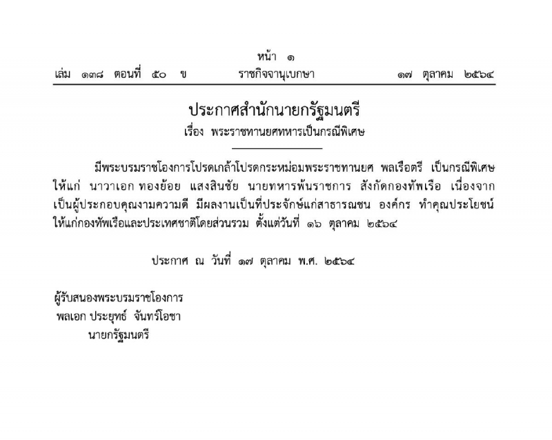 วันที่ 17 ต.ค.64 เว็บไซต์ราชกิจจานุเบกษา เผยแพร่ ประกาศสำนักนายกรัฐมนตรี เรื่อง พระราชทานยศทหารเป็นกรณีพิเศษ โดยมี พล.อ.ประยุทธ์ จันทร์โอชา นายกรัฐมนตรี เป็นผู้รับสนองพระบรมราชโองการ ความว่า มีพระบรมราชโองการโปรดเกล้าโปรดกระหม่อมพระราชทานยศ พลเรือตรี เป็นกรณีพิเศษให้แก่ นาวาเอกทองย้อย แสงสินชัย นายทหารพ้นราชการ สังกัดกองทัพเรือ เนื่องจากเป็นผู้ประกอบคุณงามความดี มีผลงานเป็นที่ประจักษ์แก่สาธารณชน องค์กร ทำคุณประโยชน์ให้แก่กองทัพเรือและประเทศชาติโดยส่วนรวม ตั้งแต่วันที่ 16 ตุลาคม 2564
