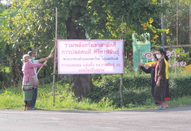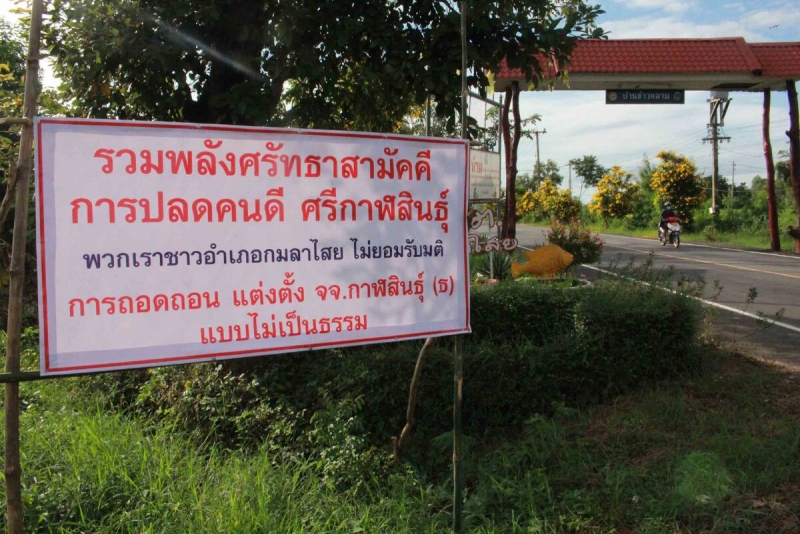 โดยที่ริมถนนสายอำเภอกมลาไสย-มหาสารคาม บริเวณปากทางเข้าบ้านข้าวหลาม ต.กมลาไสย อ.กมลาไสย จ.กาฬสินธุ์ ชาวบ้านได้นำป้าย ที่เขียนข้อความ รวมพลังศรัทธาสามัคคี การปลดคนดีศรีกาฬสินธุ์ พวกเราชาวอำเภอกมลาไสยไม่ยอมรับมติการถอดถอน แต่งตั้ง จจ.กาฬสินธุ์ (ธ)แบบไม่เป็นธรรม มาปักไว้ทางเข้าหมู่บ้าน