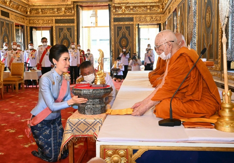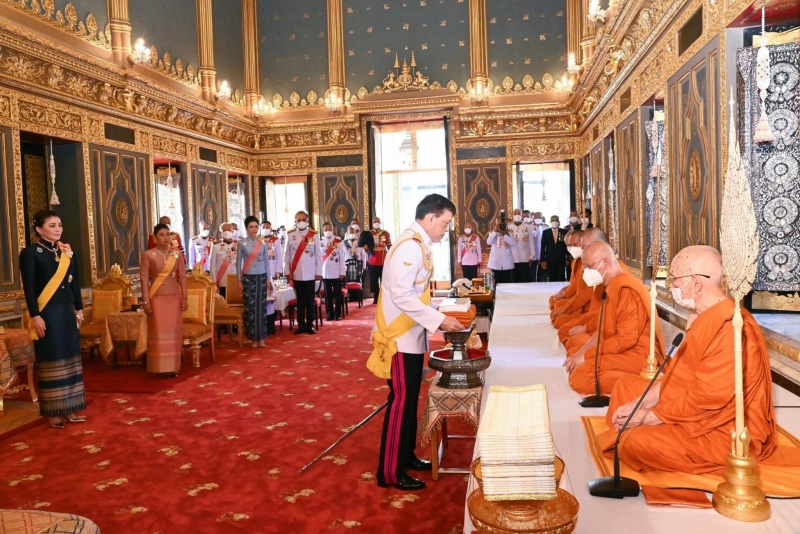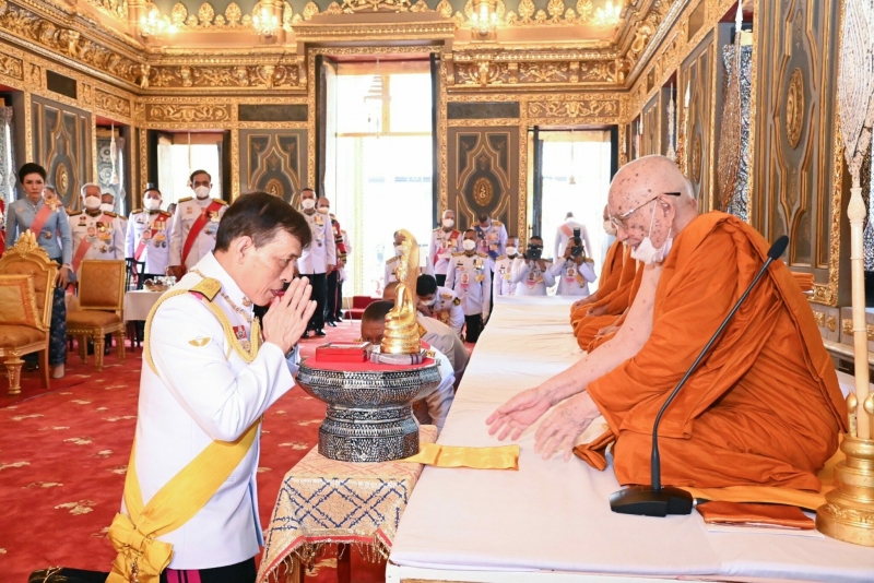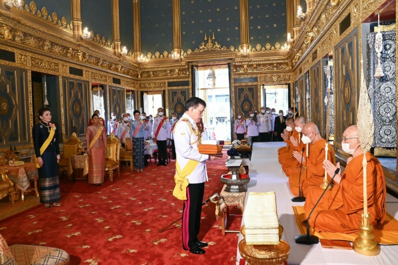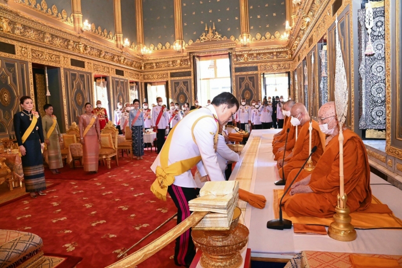 จากนั้นเสด็จเข้าพระอุโบสถ พระบาทสมเด็จพระเจ้าอยู่หัว ทรงรับผ้าไตรจากเจ้าพนักงานศุภรัต ทรงวางผ้าไตรเหนือพานแว่นฟ้าซึ่งตั้งอยู่หน้าอาสน์สงฆ์ใกล้สมเด็จพระอริยวงศาคตญาณ สมเด็จพระสังฆราช สกลมหาสังฆปริณายก ทรงจุดธูปเทียนเครื่องนมัสการบูชาพระพุทธอังคีรส พระประธานพระอุโบสถ