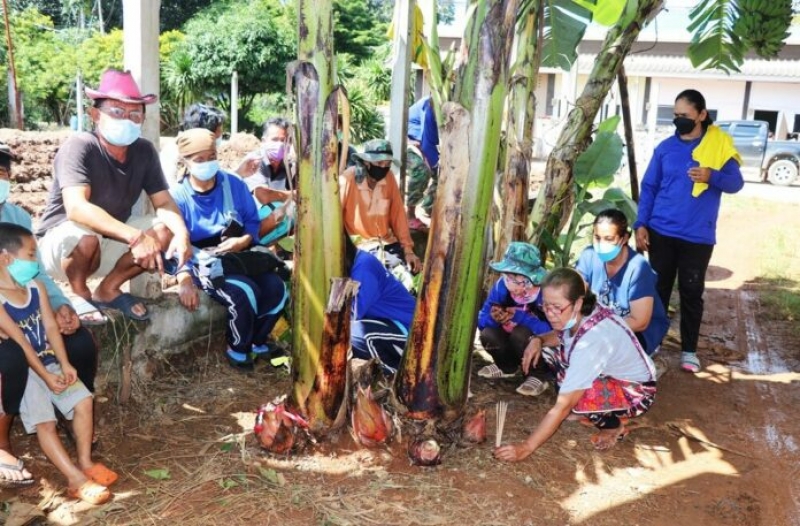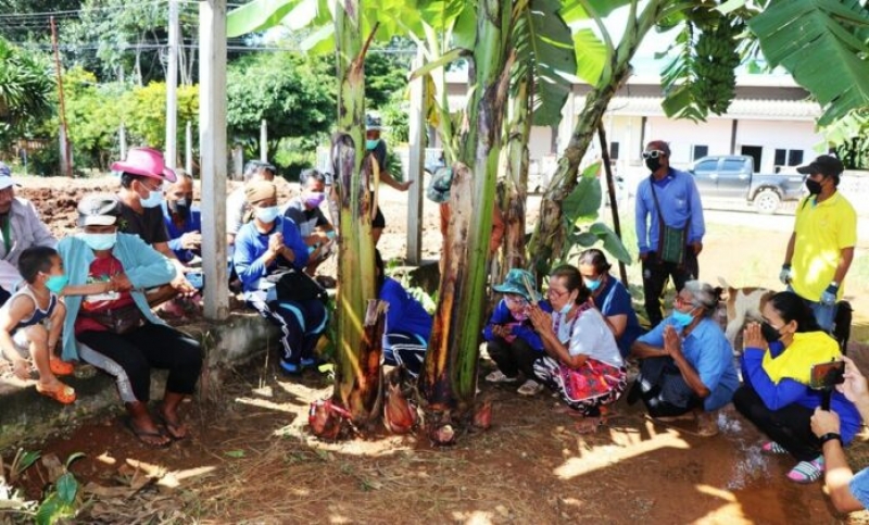 พบชาวบ้านหลายคนกำลังจุดธูปปักที่โคลนต้นกล้วย ก้มหน้ามุงดูกอกล้วยน้ำว้าอย่างจดจ่อ บางคนบอกได้เลขแล้วรีบหนีไปหาซื้อฉลากกินแบ่งรัฐบาล