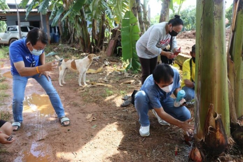 นางสุนันท์ หลีพันธ์ ผู้ใหญ่บ้าน หมู่ 6 บ้านคลองเดื่อ ซึ่งเป็นเจ้าของบ้าน ทราบว่า ปลูกไว้หลายต้นอายุประมาณ 1 ปี เศษ และปล่อยให้โตตามธรรมชาติ หลายกอออกหน่อและออกปลีตามปกติ แต่เมื่อวานเดินไปดูกล้วย เพื่อจะดูว่า มีเครือไหนที่แก่จัดจะตัดไปร่วมบุญกฐินที่จะมีขึ้นในวันที่ 7 พ.ย. ที่วัดธารอุทุมพร