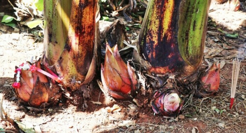 นางสุนันต์ เล่าว่า หน่อกล้วยทั่วไปโผล่ขึ้นจากดินก็จะมีใบแทงออกมาเลย แต่ที่กล้วยกอนี้พบว่าหน่อกล้วยโผล่ขึ้นจากดินคล้ายดอกบัวตูม เกิดมานานและปลูกกล้วยมามาก แต่ไม่เคยเจอหน่อกล้วยแบบนี้