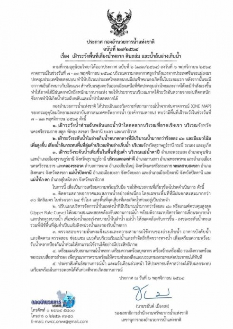 อย่างไรก็ตาม กองอำนวยการน้ำแห่งชาติ ออกประกาศ เตือนพื้นที่ 11 จังหวัดใต้ ที่คาดว่าจะได้รับผลกระทบ เสี่ยงน้ำท่วม น้ำป่า เตรียมพร้อมอพยพทันที