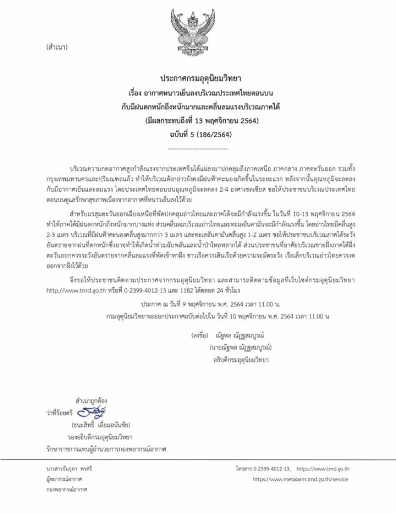เมื่อวันที่ 9 พฤศจิกายน นายณัฐพล ณัฏฐสมบูรณ์ อธิบดีกรมอุตุนิยมวิทยา ออกประกาศกรมอุตุนิยมวิทยา เรื่อง อากาศหนาวเย็นลงบริเวณประเทศไทยตอนบน กับมีฝนตกหนักถึงหนักมากและคลื่นลมแรงบริเวณภาคใต้ (มีผลกระทบถึงวันที่ 13 พฤศจิกายน 2564) ฉบับที่ 5 ระบุว่า