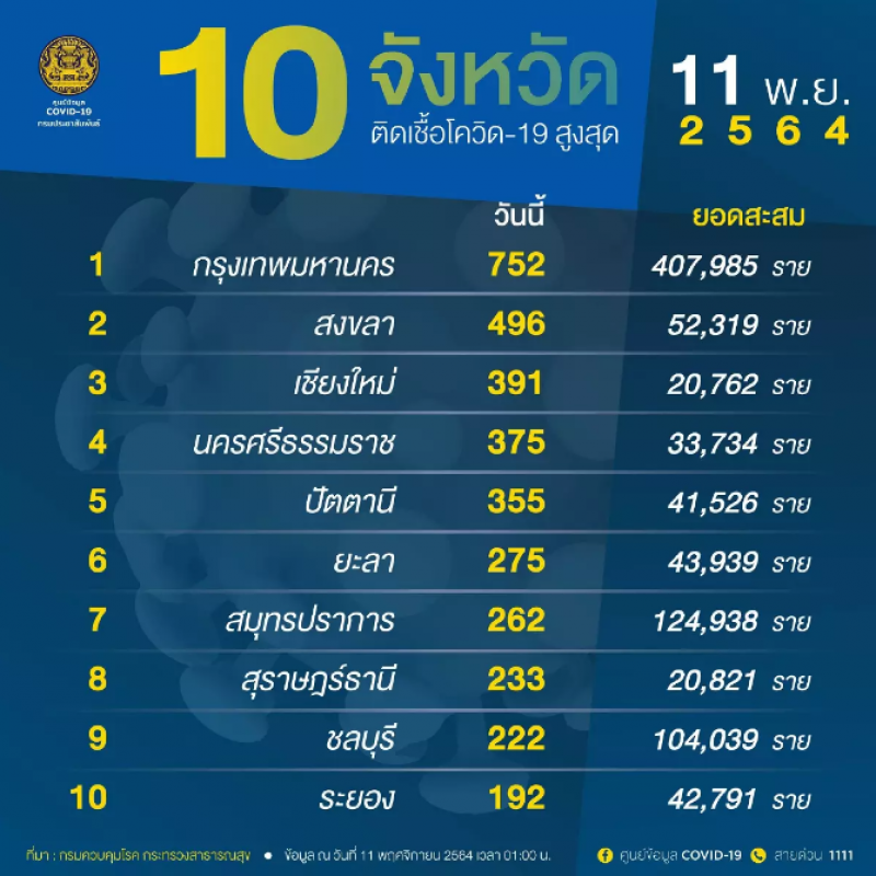 จํานวนผู้ติดcvในประเทศรายใหม่ วันที่ 11 พฤศจิกายน 2564 ตรวจสอบ 10 จังหวัดอันดับ