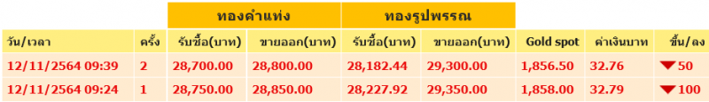 ล่าสุด เมื่อเวลา 09.39 น. ได้มีการปรับราคาทองในครั้งที่2 ลงอีก 50 บาท สรุปราคาทองคำ วันที่ 12 พ.ย.2564