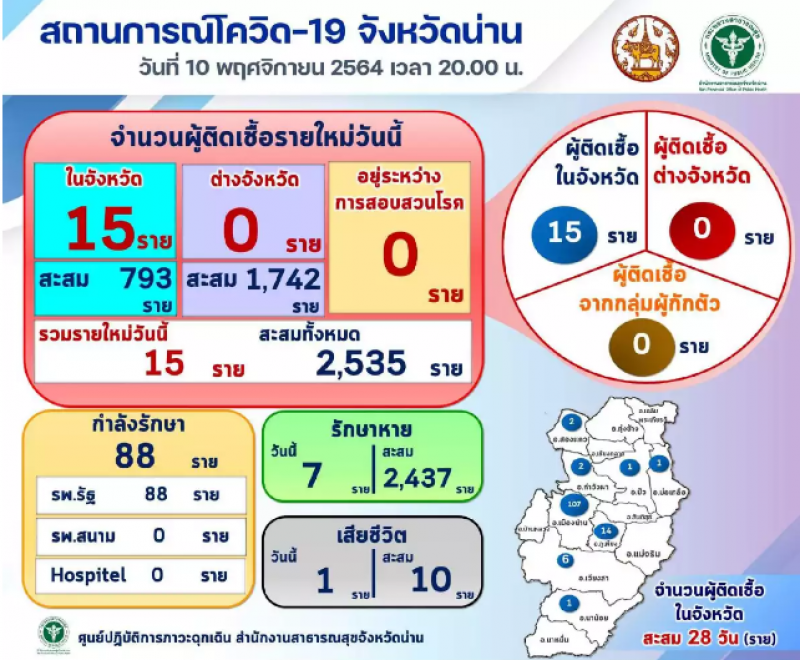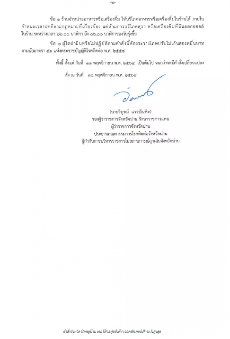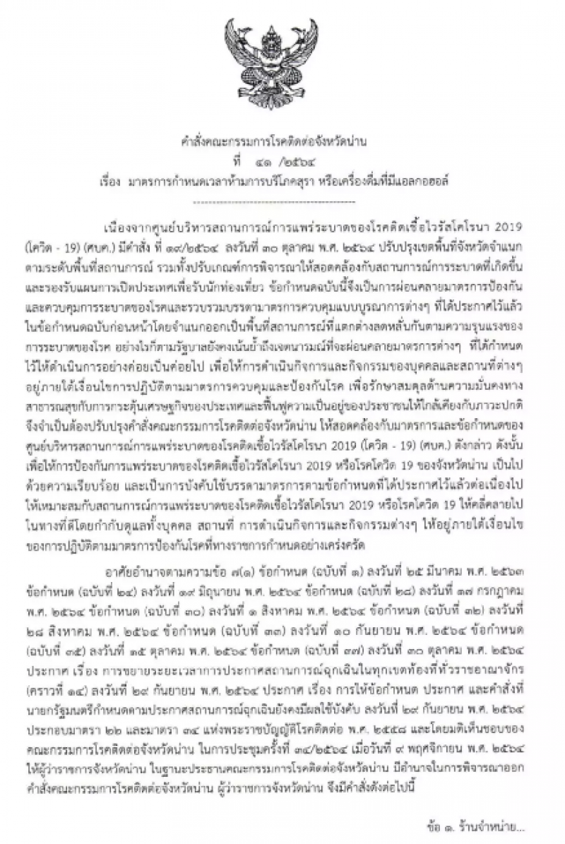 คณะกรรมการติดต่อจังหวัดน่านจึงมีมติออกประกาศ เรื่องการบริโภคเครื่องดื่มในร้านอาหาร สั่งห้าม ระหว่างเวลา 22.00 น. ถึง 06.00 น. ของวันรุ่งขึ้น มีผลตั้งแต่วันที่ 11 พฤศจิกายน 2564 เป็นต้นไป จนกว่าจะมีคำสั่งเปลี่ยนแปลง