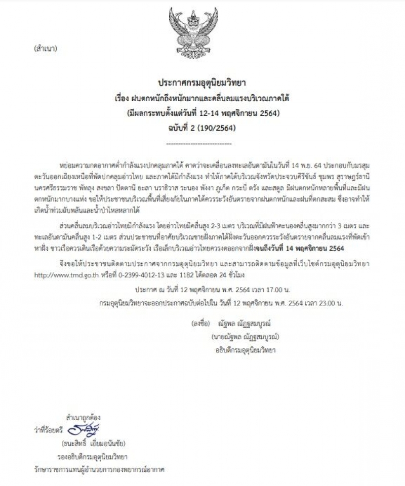 เมื่อเวลา 17.00 น. วันที่ 12 พ.ย.64 นายณัฐพล ณัฏฐสมบูรณ์ อธิบดีกรมอุตุนิยมวิทยา ออกประกาศกรมอุตุนิยมวิทยาฉบับที่ 2 เรื่อง ฝนตกหนักถึงหนักมากและคลื่นลมแรงบริเวณภาคใต้ (มีผลกระทบตั้งแต่วันที่ 12-14 พ.ย.64) ระบุว่า หย่อมความกดอากาศต่ำกำลังแรงปกคลุมภาคใต้ คาดว่าจะเคลื่อนลงทะเลอันดามันในวันที่ 14 พ.ย. 64