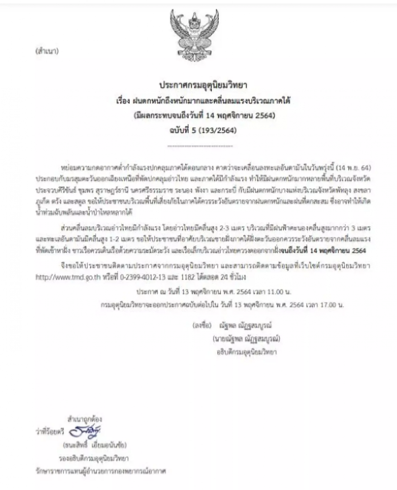 ประกาศกรมอุตุนิยมวิทยา ฝนตกหนักถึงหนักมากและคลื่นลมแรงบริเวณภาคใต้ (มีผลกระทบจนถึงวันที่ 14 พฤศจิกายน 2564) ฉบับที่ 5 ลงวันที่ 13 พฤศจิกายน 2564