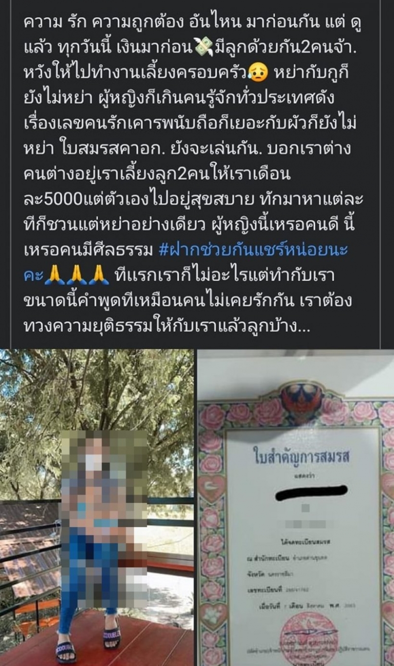โดยสามีขอส่งเสียเงินให้ลูกเดือนละ 10,000 บาท แต่ต้องแบ่งให้แม่เดือนละ 5,000 บาท ตนเองก็เลยถามไปว่าเงินเดือนได้แค่เดือนละ 10,500 ถ้าส่งเสียลูกหมดจะเอาไรกิน เขาก็บอกว่าไม่เป็นไร เดี๋ยวเบิกค่าน้ำมันหรือหายืมคนอื่นเอา