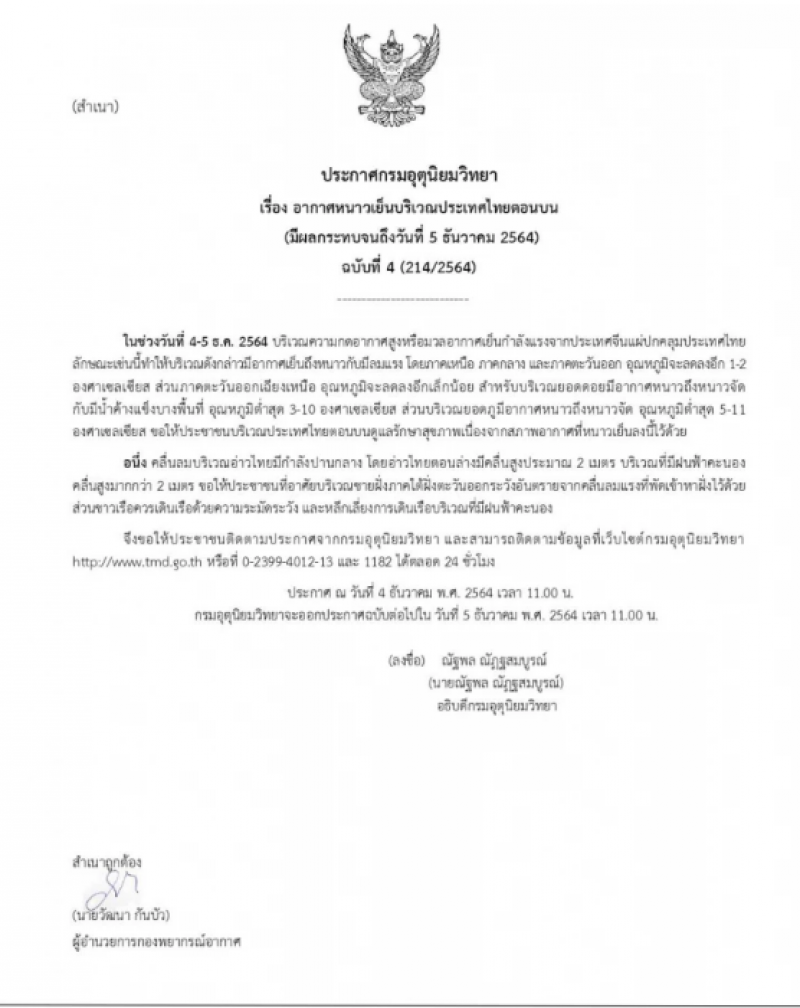 ระบุว่า ประกาศกรมอุตุนิยมวิทยา อากาศหนาวเย็นบริเวณประเทศไทยตอนบน (มีผลกระทบจนถึงวันที่ 5 ธันวาคม 2564) ฉบับที่ 4 ลงวันที่ 04 ธันวาคม 2564