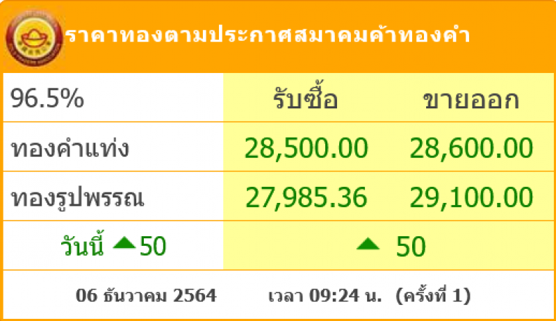 วันที่ 6 ธันวาคม 2564 สมาคมค้าทองคำรายงานว่า ราคาทองไทยวันนี้ ครั้งที่ 1 เมื่อเวลา 09.24 น. ราคาทองปรับขึ้น 50 บาท ส่งผลให้ ทองคำแท่ง รับซื้อบาทละ 28,500 ขายออกบาทละ 28,600 บาท ส่วน ทองรูปพรรณ รับซื้อบาทละ 27,985.36 ขายออกบาทละ 29,100 บาท