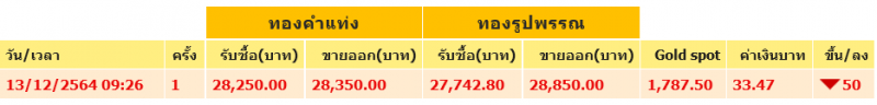 วันที่ 13 ธันวาคม 2564 สมาคมค้าทองคำรายงานว่า ราคาทองไทยวันนี้ ครั้งที่ 1 เมื่อเวลา 09.26 น. ราคาทองปรับลด 50 ส่งผลให้ ทองคำแท่ง รับซื้อบาทละ 28,250 ขายออกบาทละ 28,350 บาท ส่วน ทองรูปพรรณ รับซื้อบาทละ 27,742.80 ขายออกบาทละ 28,850 บาท