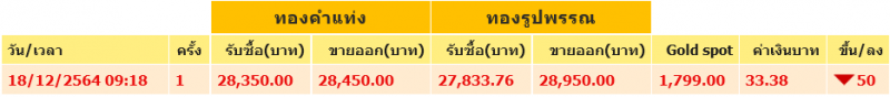 วันที่ 18 ธันวาคม 2564 สมาคมค้าทองคำรายงานว่า ราคาทองไทยวันนี้ ครั้งที่ 1 เมื่อเวลา 09.18 น. ราคาทองปรับลด 50 บาท ส่งผลให้ ทองคำแท่ง รับซื้อบาทละ 28,350 ขายออกบาทละ 28,450 บาท ส่วน ทองรูปพรรณ รับซื้อบาทละ 27,833.76 ขายออกบาทละ 28,950 บาท