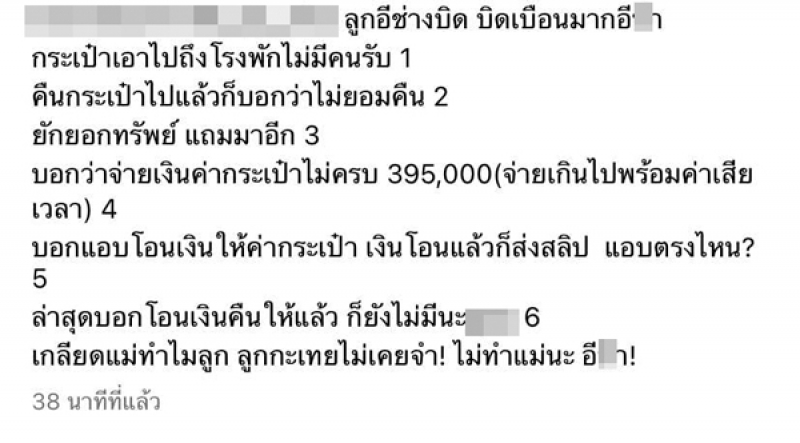 ขณะเดียวกันทางแม่ค้ายังโพสต์โวยสื่อ หาว่าถูกบิดเบือน โดยในส่วนที่หาว่าจ่ายเงินค่ากระเป๋าไม่ครบเพราะให้ไปแค่ 395,000 บาท ทั้งที่ตนจ่ายเกินไปพร้อมค่าเสียเวลา รวมถึงมีการส่งสลิปเงินโอนให้ แบบนี้เรียกแอบโอนตรงไหน