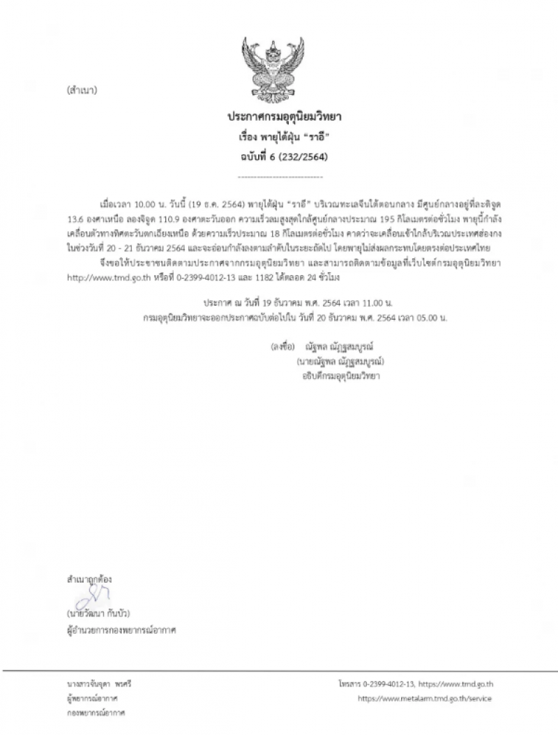 กรมอุตุฯ ประกาศฉบับที่ 6 พายุไต้ฝุ่น ราอี
